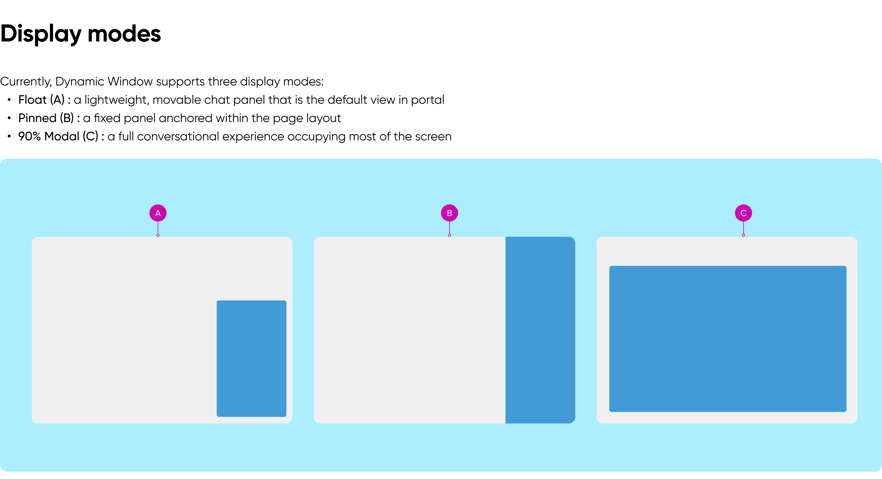 We needed the AI to adapt to the user's context. I designed a responsive system that supports three distinct modes: Float (for quick Q&A), Pinned (for side-by-side work), and Modal (for immersive, complex tasks).